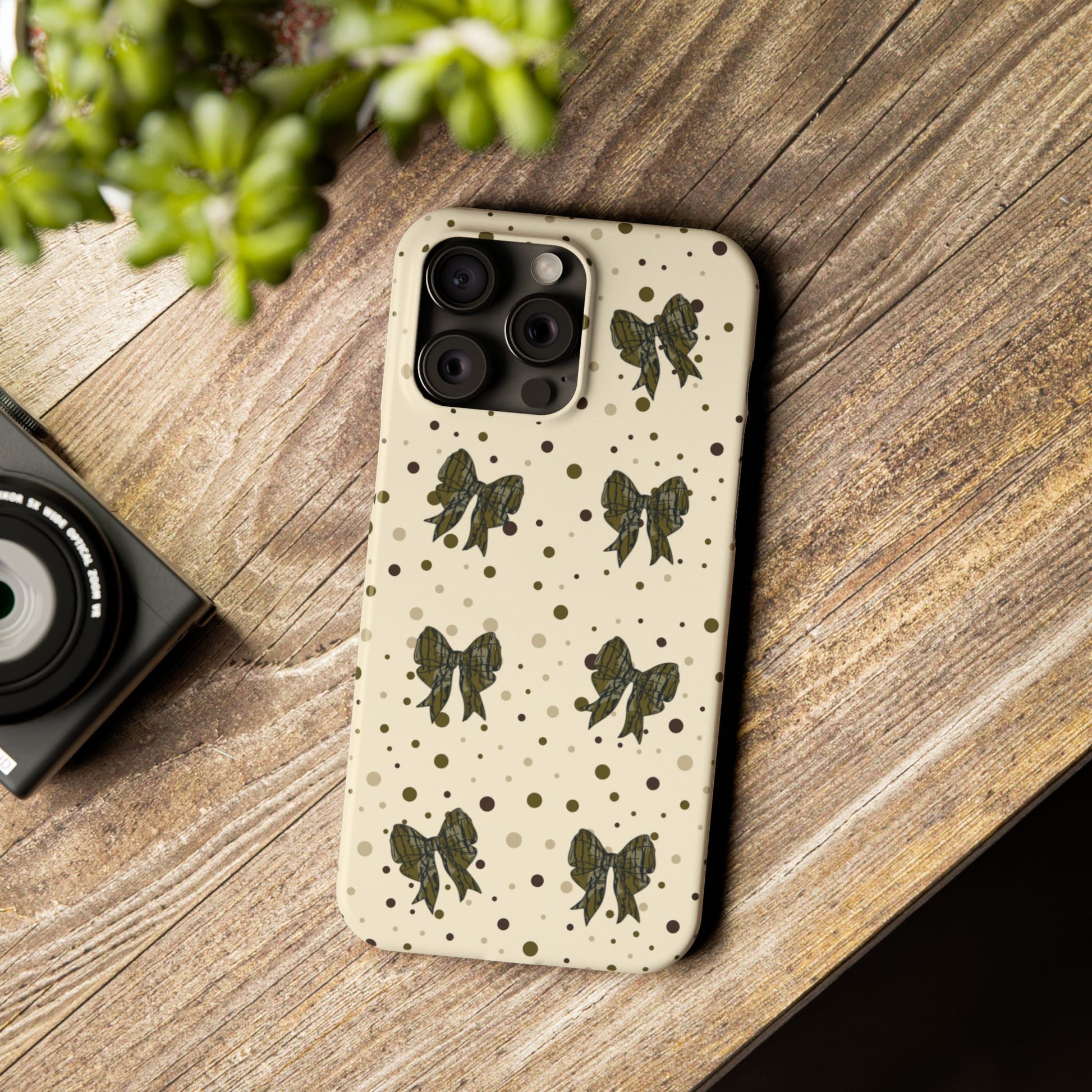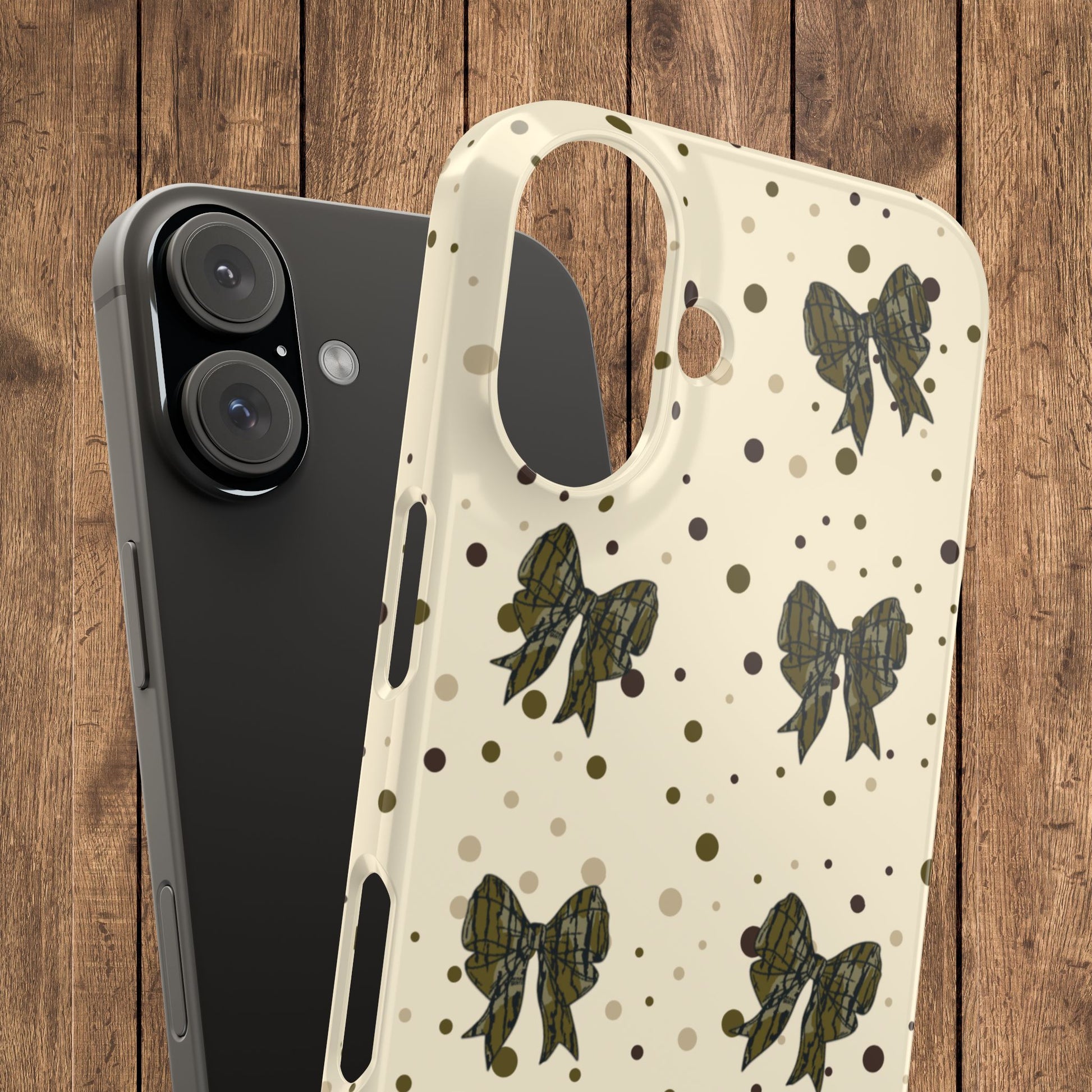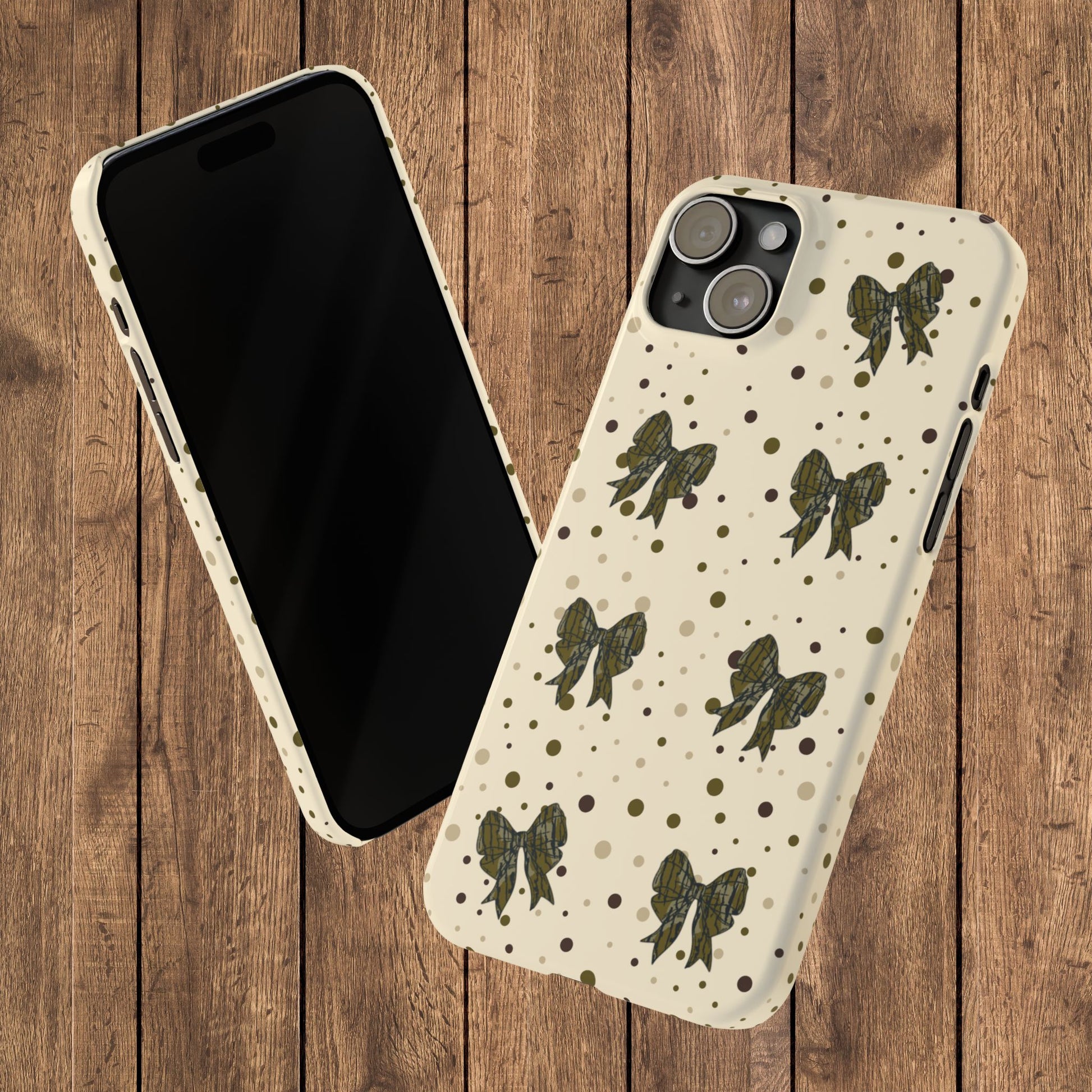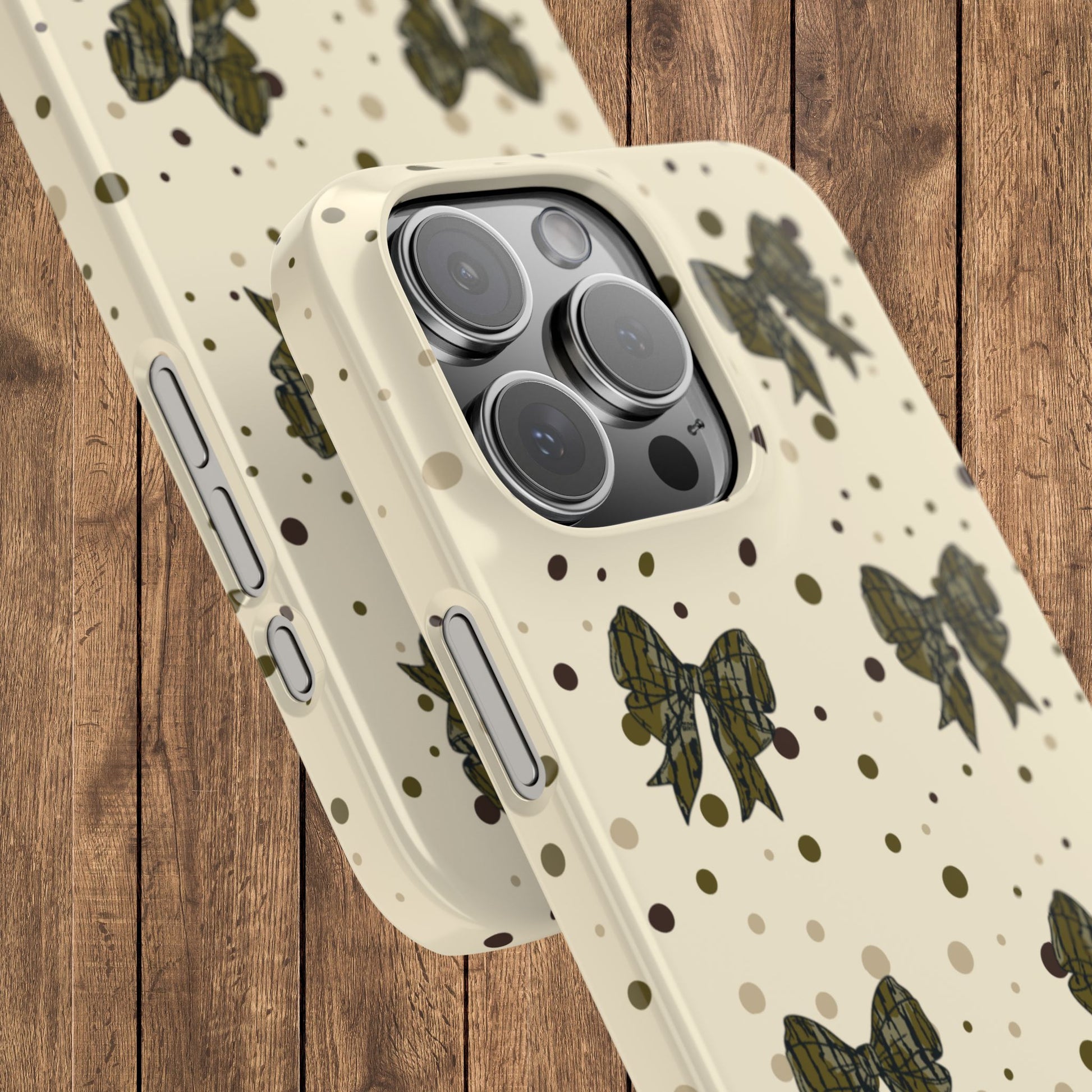 This Bottomland Camouflage Coquette Bows & Polka Dot Phone Case adds a touch of style and protection to your phone. The slim design and glossy finish give off a chic vibe, making it perfect for fashion-forward individuals. Ideal for those who love the outdoors, hunting, or camouflage patterns. Great for gifting during birthdays, Christmas, or other special occasions.