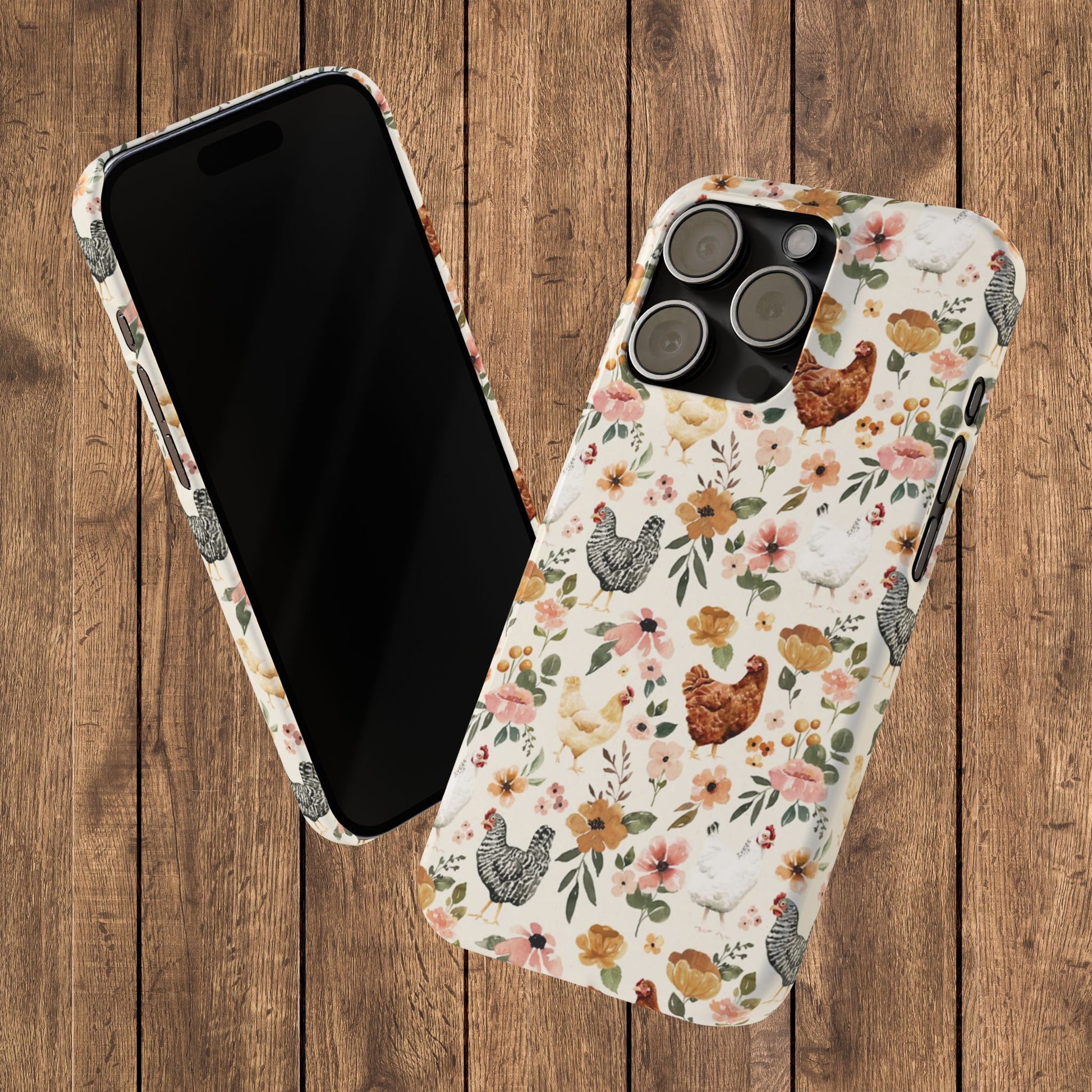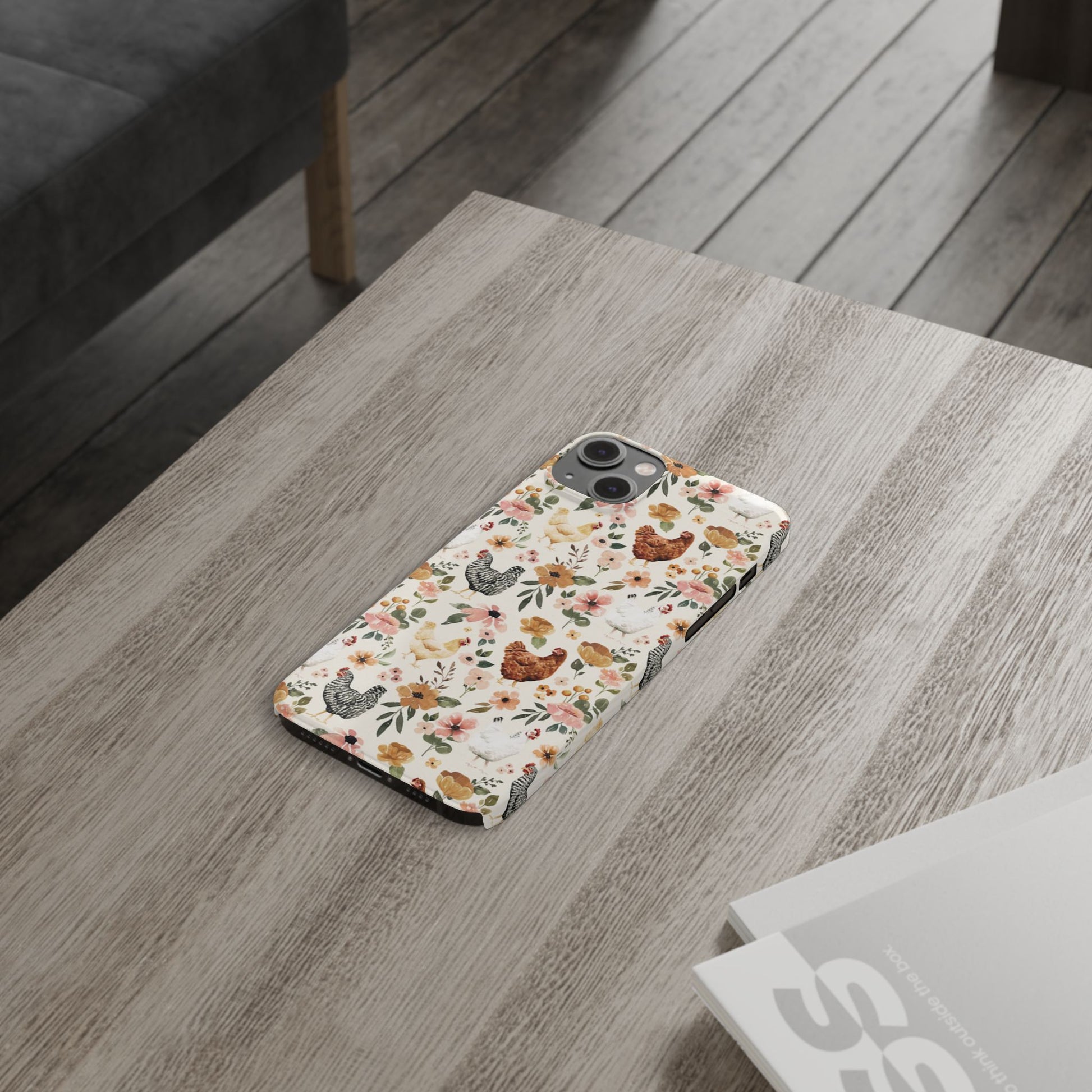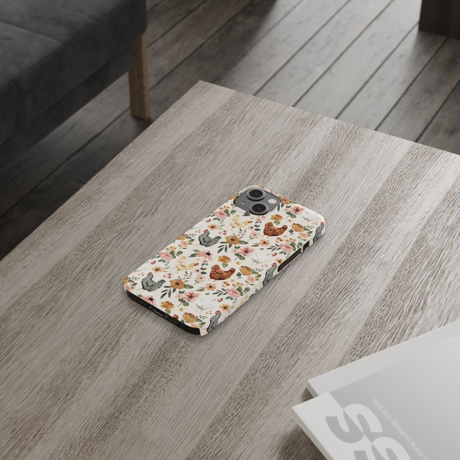 This charming floral chicken slim iPhone case exudes a whimsical and stylish vibe, perfect for those who appreciate nature-inspired design. It is ideal for individuals looking to protect their phones in a sleek and fashionable way. This phone case is relevant for spring and summer seasons, as well as Easter celebrations.