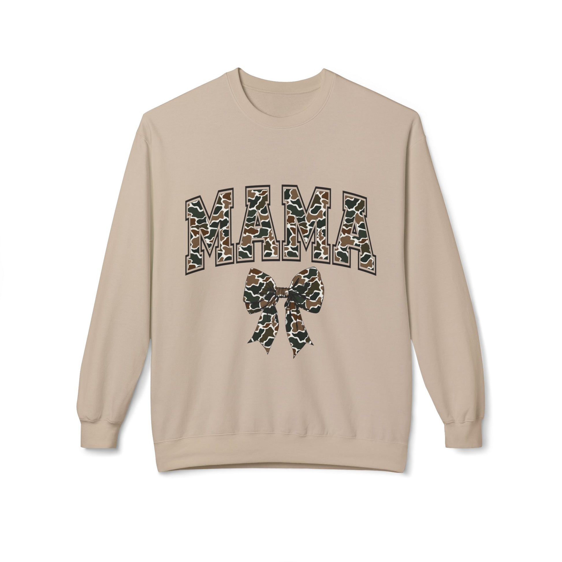 A cozy Mama Old Camo Bow Coquette Women's Sweatshirt perfect for lounging or casual outings. The unique design adds a touch of style and personality, making it a great addition to any wardrobe. Ideal for moms or women who enjoy camo patterns and want to make a statement.