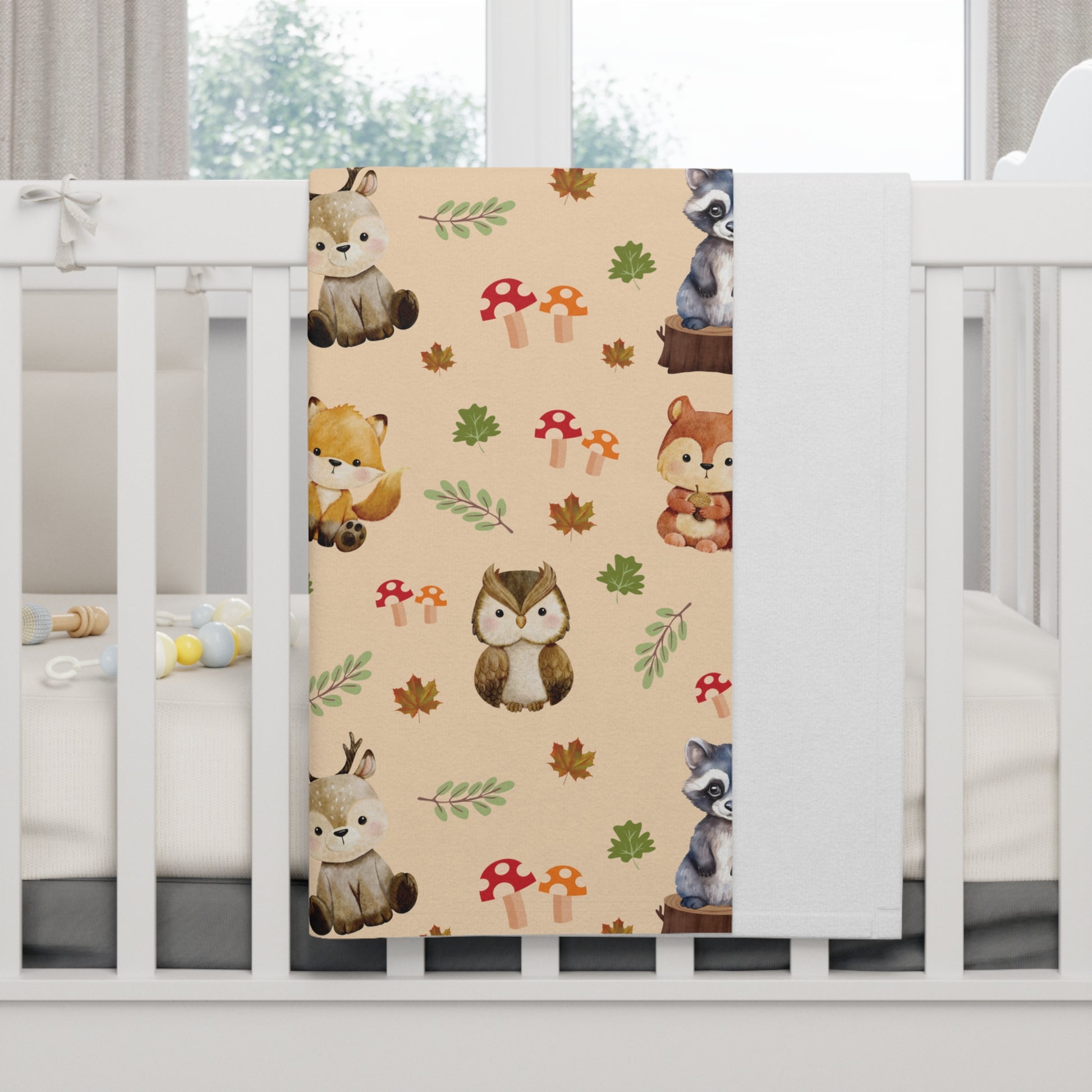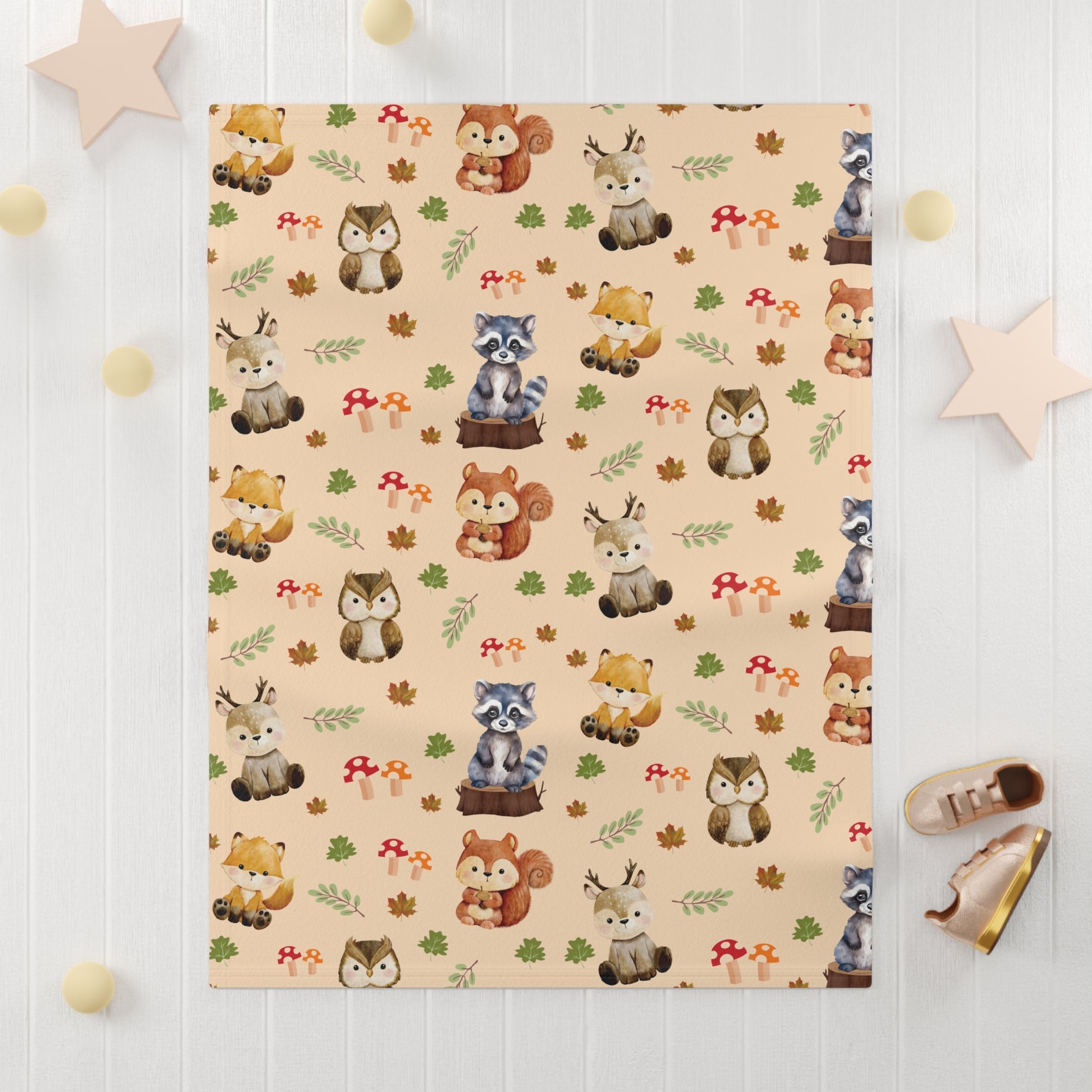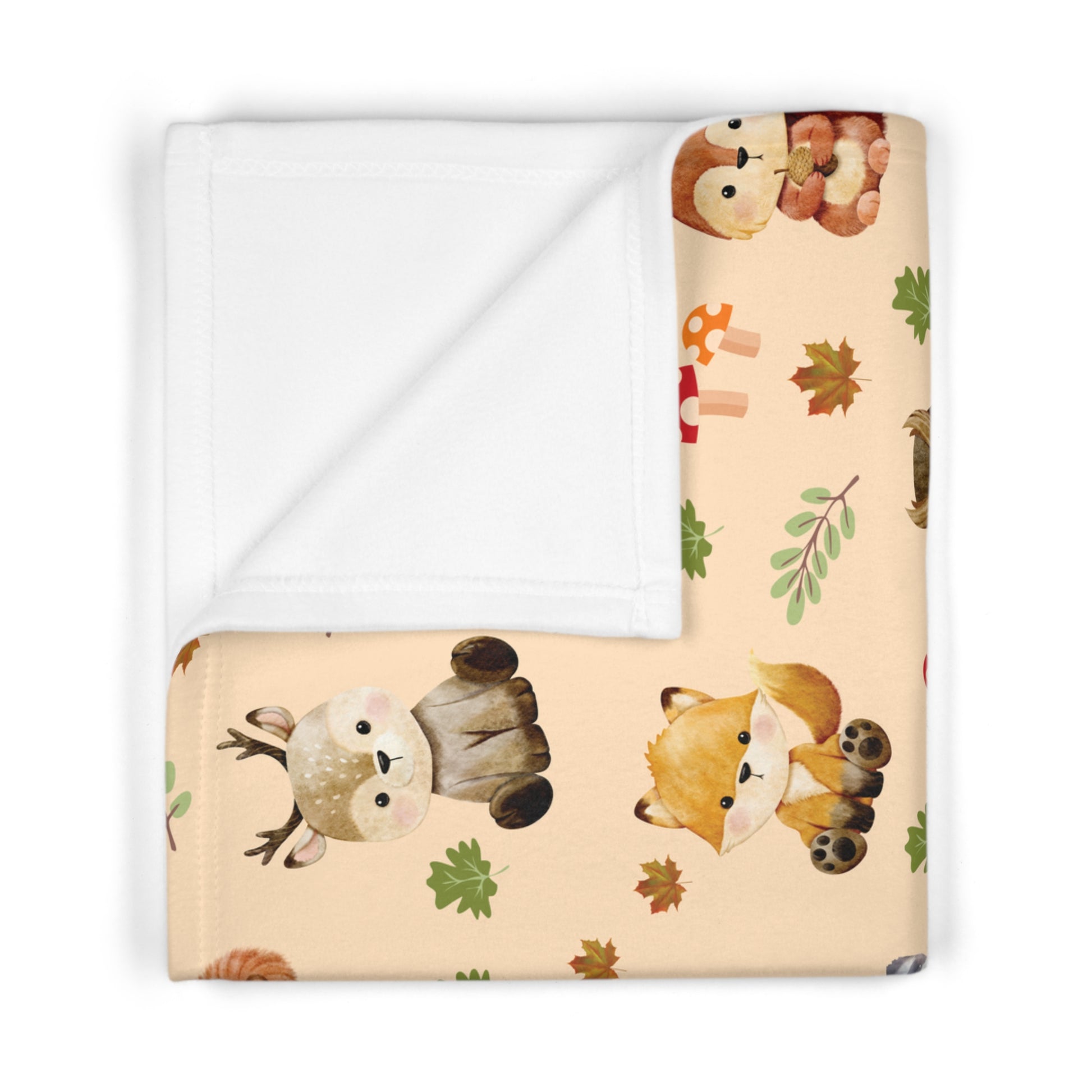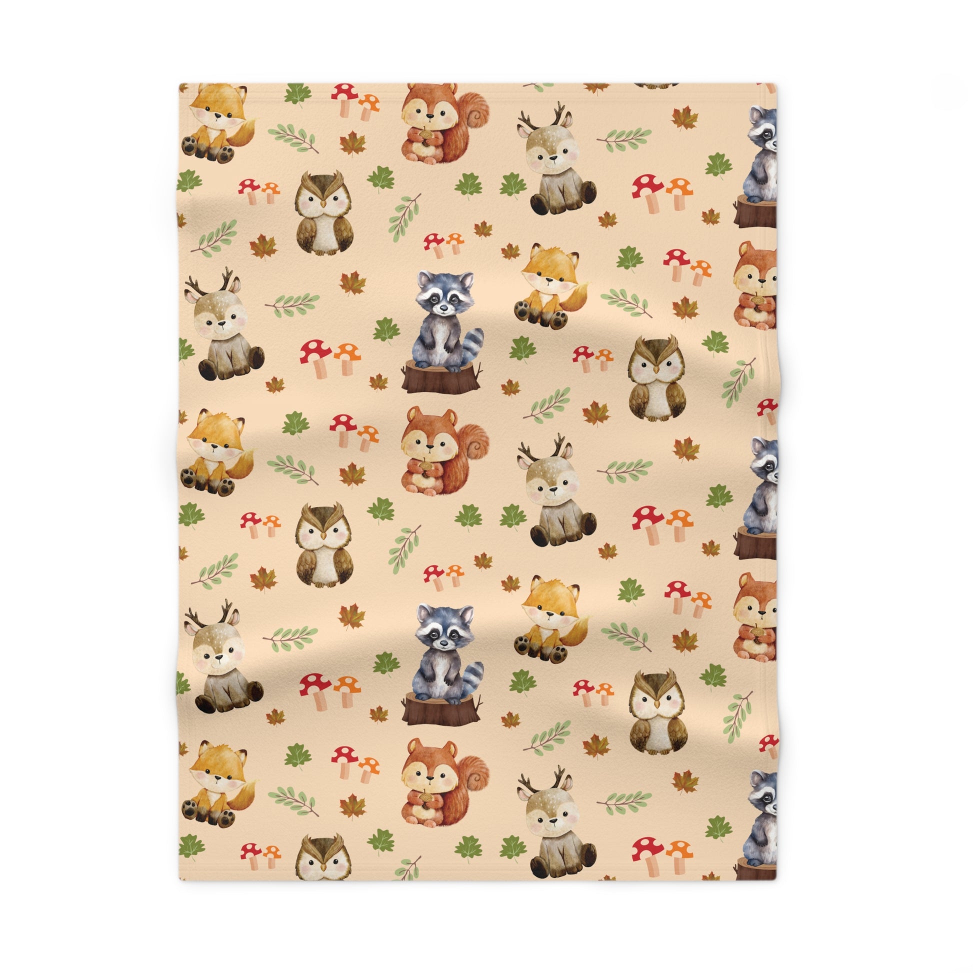 Woodland Animals Themed Soft Fleece Blanket featuring a squirrel, raccoon, deer, owl, and leaves. This cozy blanket gives off a cute and whimsical vibe, perfect for keeping babies warm and comforted. Ideal for nature lovers and parents looking for a charming nursery decor. Suitable for baby showers, birthdays, and holidays like Christmas.